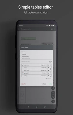 You can create tables, keys, columns, and change parameters, colors for it, and many others. For creating SQL just tap one button and use SQL in your database. If you want to show scheme somebody, just exports in a picture and sends it. Without ads.