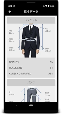 ▼シャツとパンツ姿で2枚の写真を撮り数項目入力するだけで、オーダースーツの出来上がりサイズや、店内のスーツのサイズが分かる無料のアプリです。